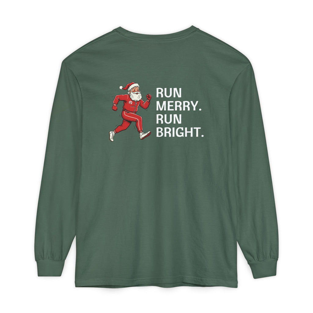 Bring some festive cheer to your miles with our “Run Merry. Run Bright.” holiday tee. Featuring a spirited illustration of Santa mid-stride in his classic red suit—complete with sneakers—this design blends holiday magic with runner energy. Bold, cheerful lettering makes the message unmistakable: keep the season bright, and keep moving.