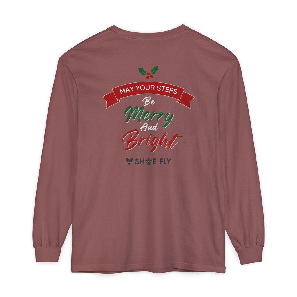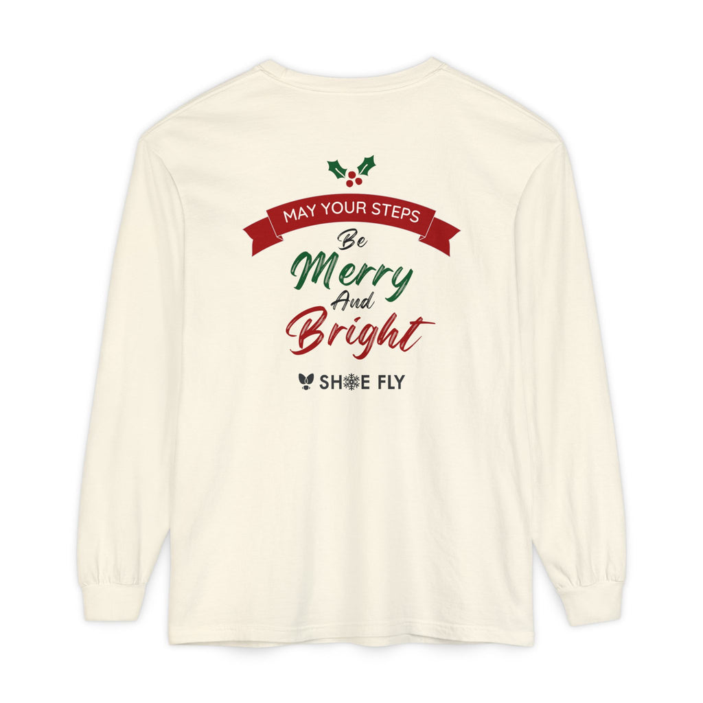 Celebrate the season in timeless style with our Shoe Fly “Merry & Bright” Holiday Tee. The front features our classic SHOE FLY logo with a charming snowflake in place of the “O,” adding just the right touch of holiday spirit. On the back, a festive banner and holly accents frame the message “May Your Steps Be Merry and Bright,” bringing warmth and cheer to every stride. Design by Lauren K. from our Marketing Team.